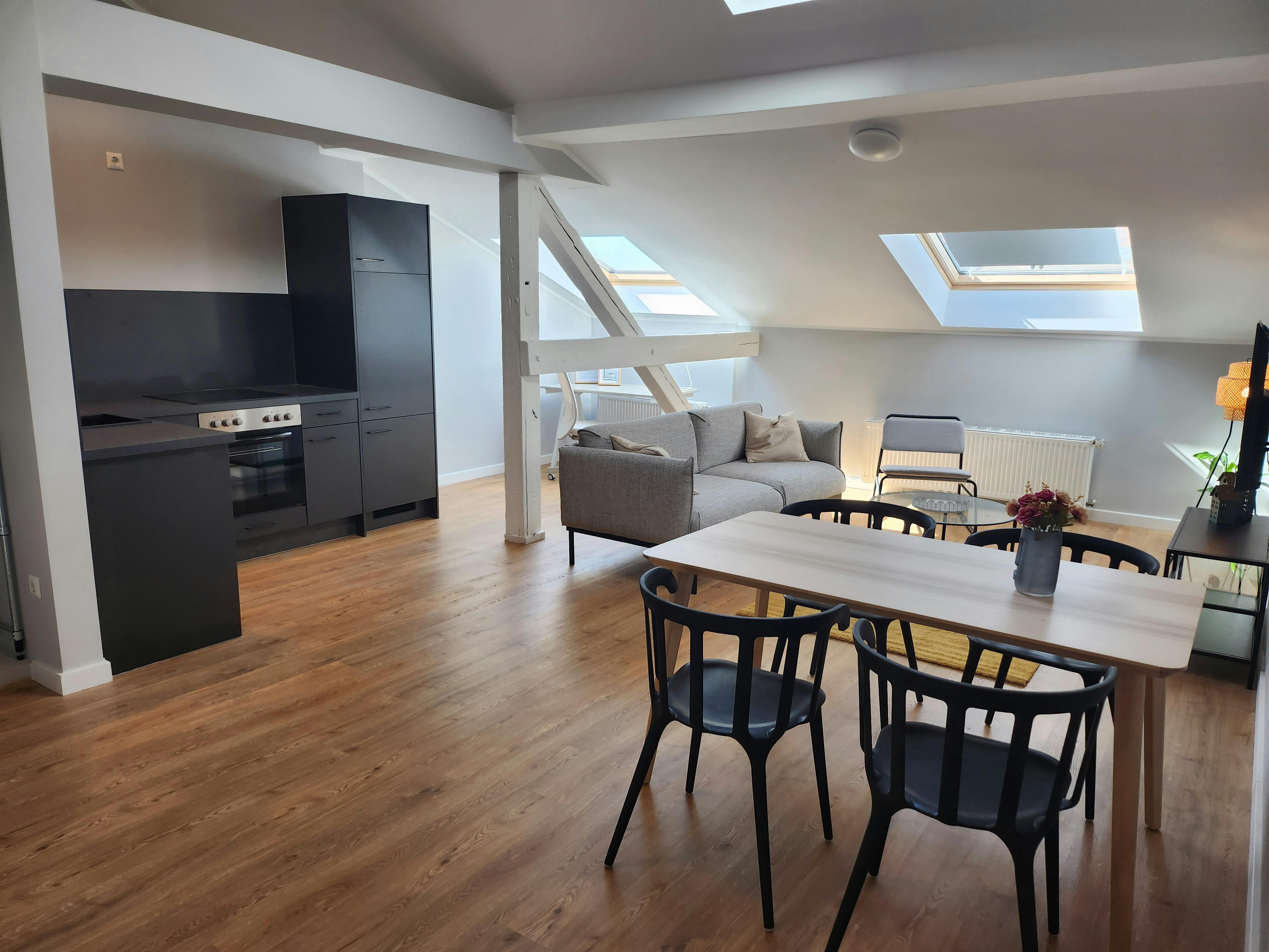 Welcome to our stunning duplex apartment, where light floods every corner and panoramic views of the city's rooftops await you. This beautiful, completely renovated maisonette apartment on the fifth floor in Frankfurter Tor enjoys the sun all day long and impresses with a panoramic view of the Frankfurter Tor crossing.