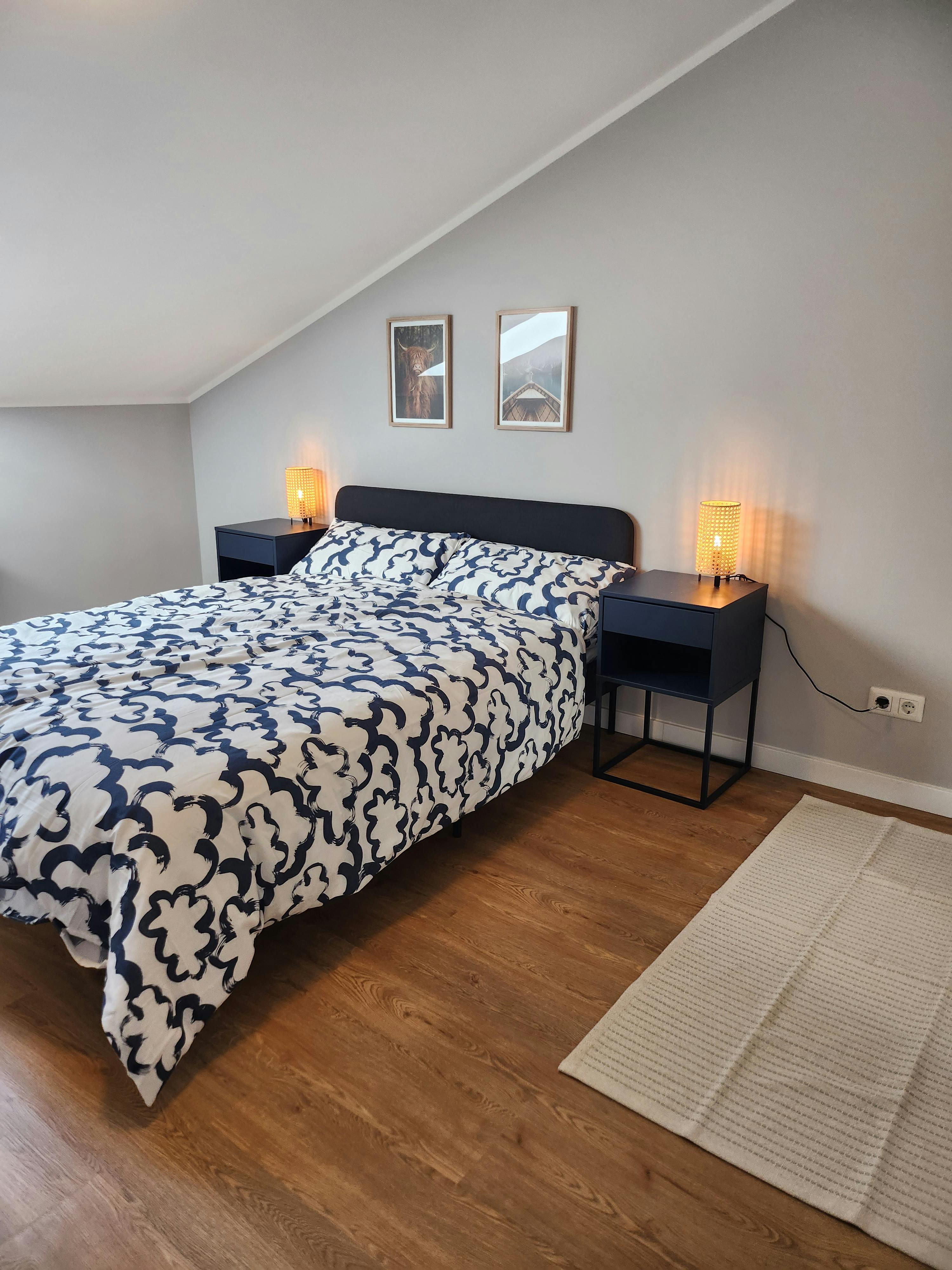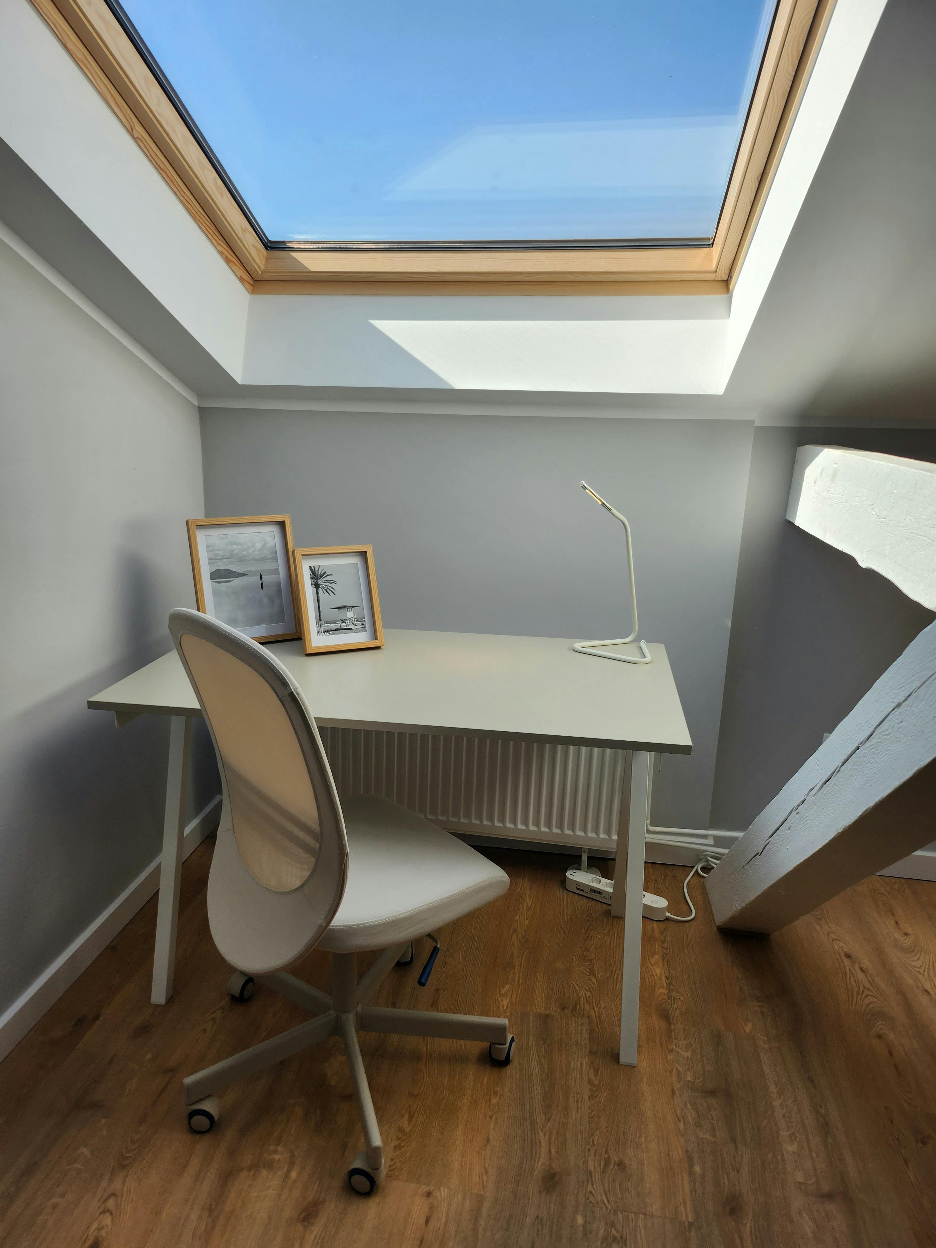 Ascend the stairs to discover a dedicated working area which boasts the best view, providing a picturesque backdrop for productivity and inspiration, a charming balcony offering rooftop views, and a bedroom for two adorned with a cozy chair for moments of relaxation.