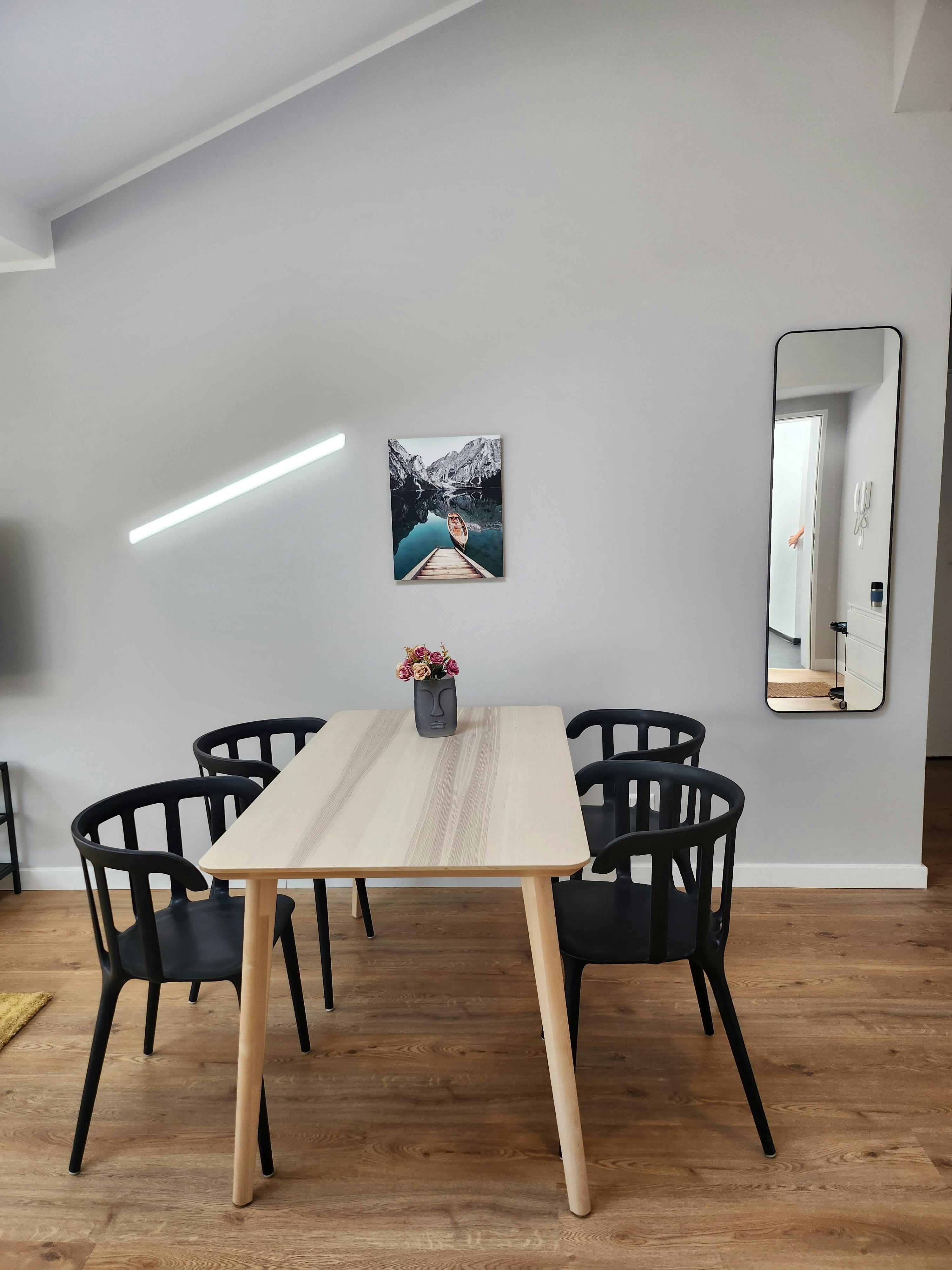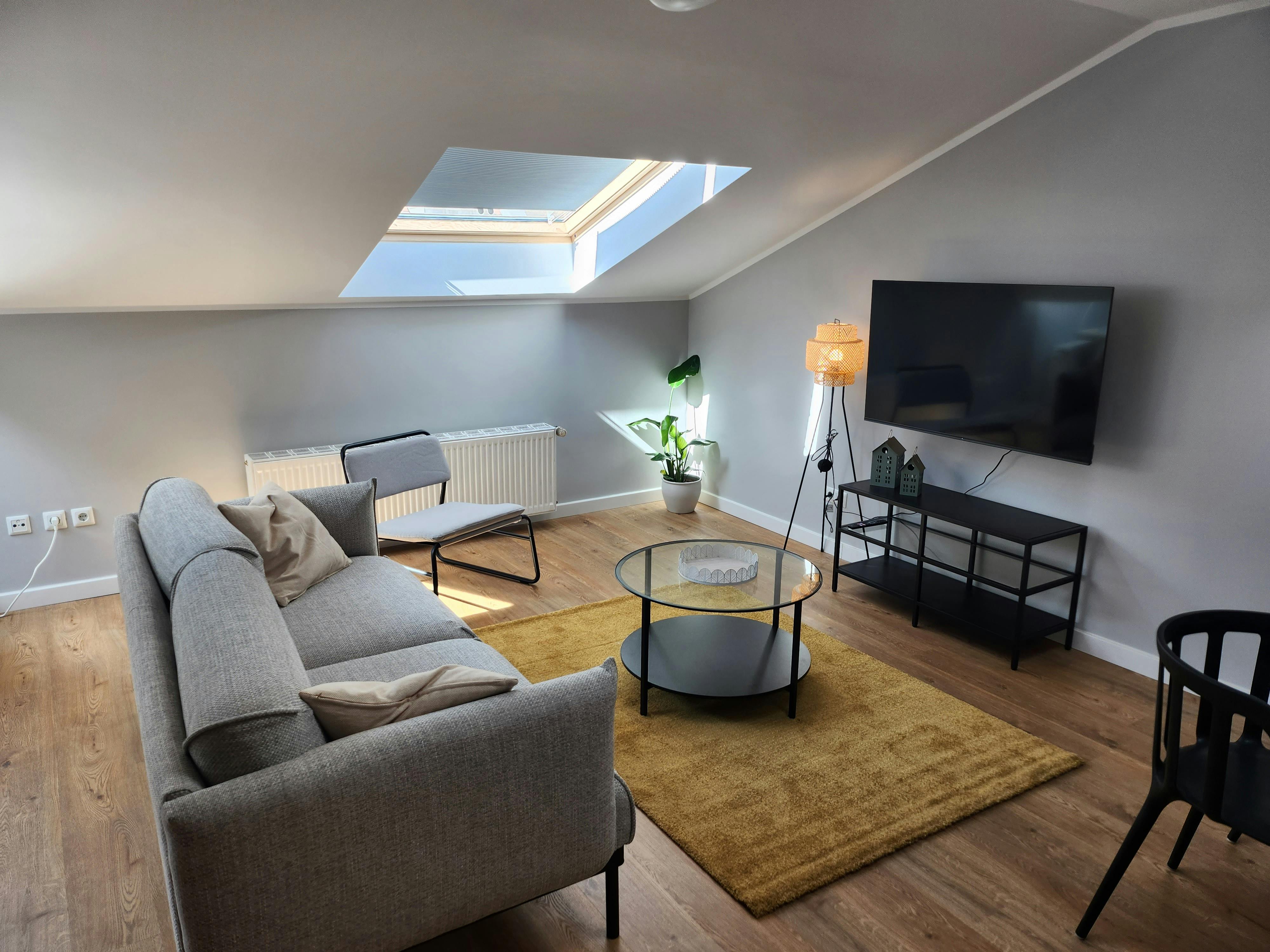 From here, you can seamlessly transition into the inviting living room, complete with a large comfortable sofa which easily can be transformed into a sofa bed if you are traveling as a group of four. It also counts with a television including Apple TV, and a spacious dining table for four.