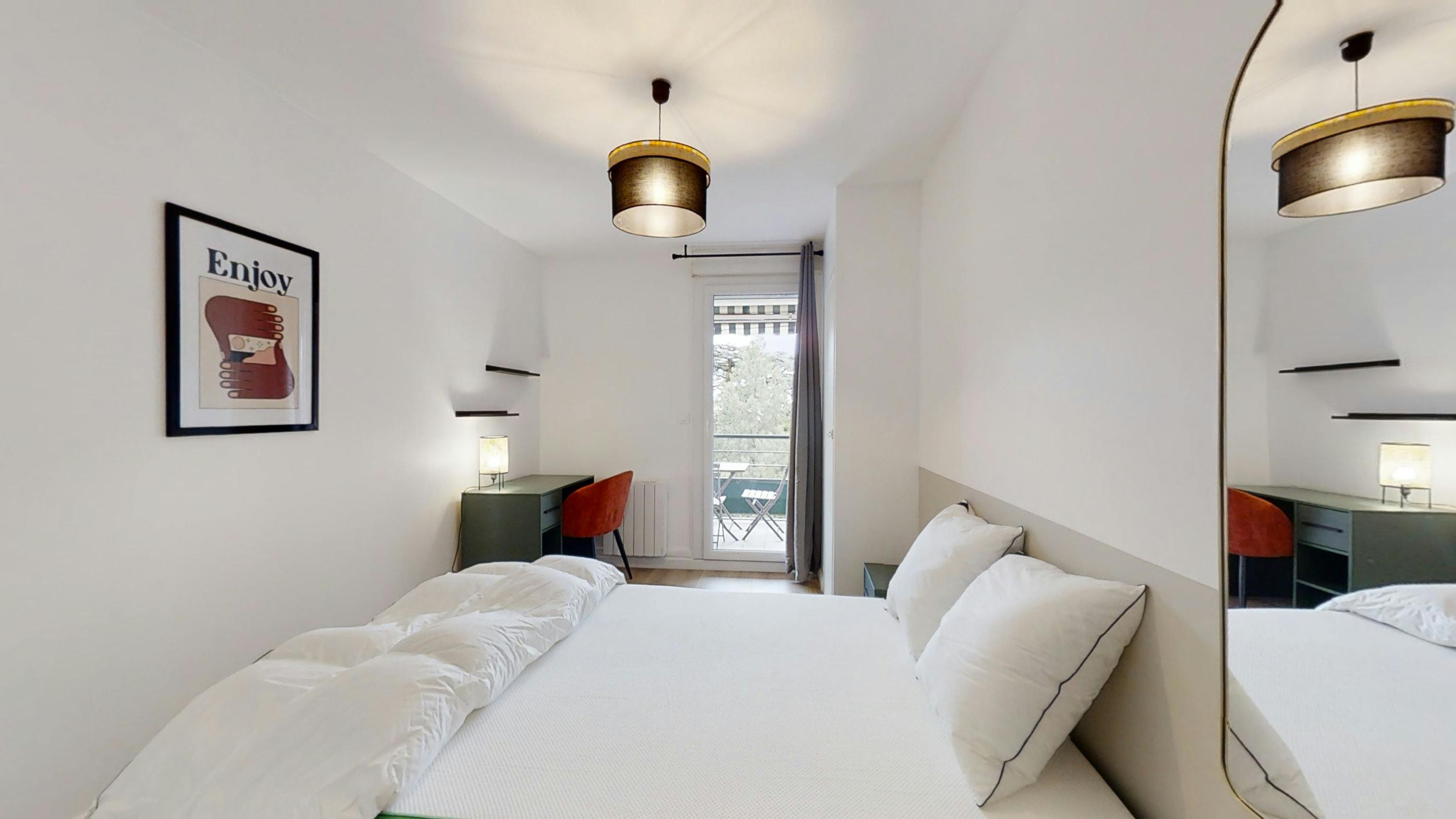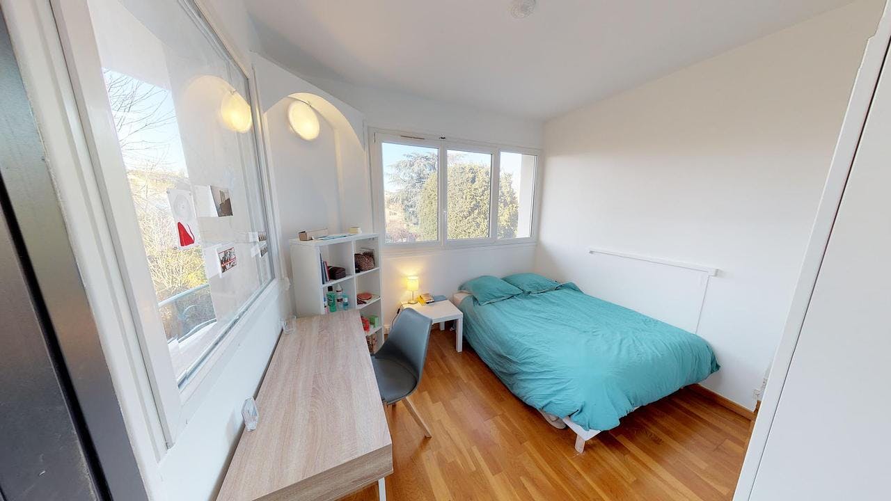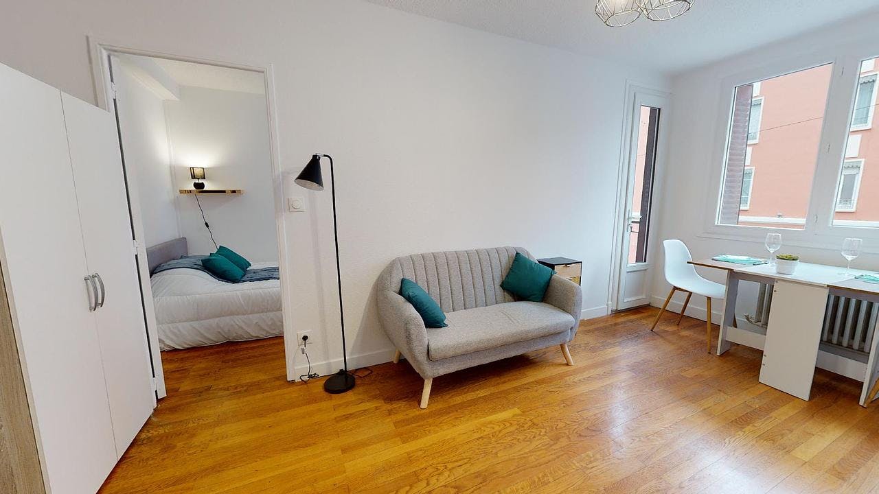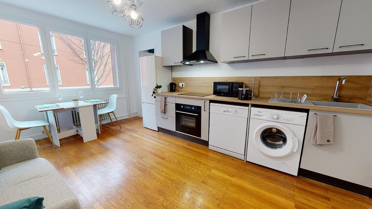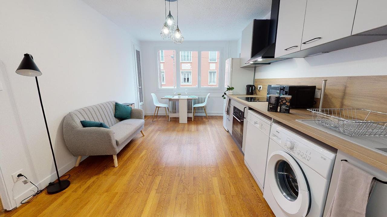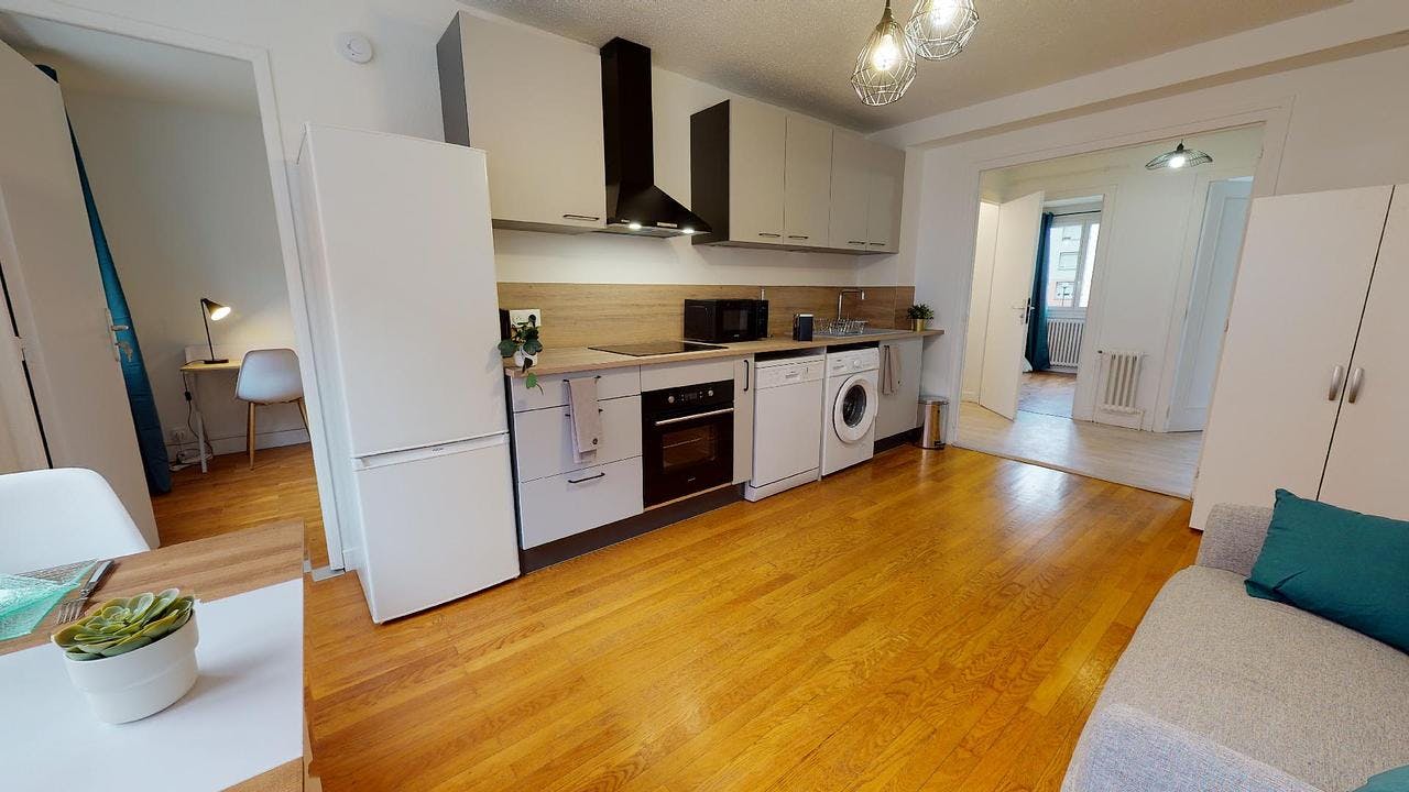 This lovely private bedroom in a fully equipped, furnished and all-inclusive flatshare in Lyon is a mix of comfort and design. It has got household furnishings, including a bed with pillows and duvet What is missing is your things to feel at home! The room can be locked if you need intimacy. The flatshare can be found in the Monchat neighborhood, in the heart of Lyon. Plenty of shops, public transports, restaurants are accessible close by. The apartment is on floor 0 without lift. It is entirely equipped and is composed of a large kitchen with refrigerator, microwave, pans, crockery, kitchen ustensils, kettle... The accommodation also contains an ironing board, a washing machine, a clothes rack, an iron. Additionally, you will find cleaning items in the accommodation: bagless hoover, dustpan and brush, broom, mop and bucket... Every Joivy furnished flatshare includes all expenses: housing insurance, water, electricity, unlimited wi-fi, condominium fees, household waste tax.