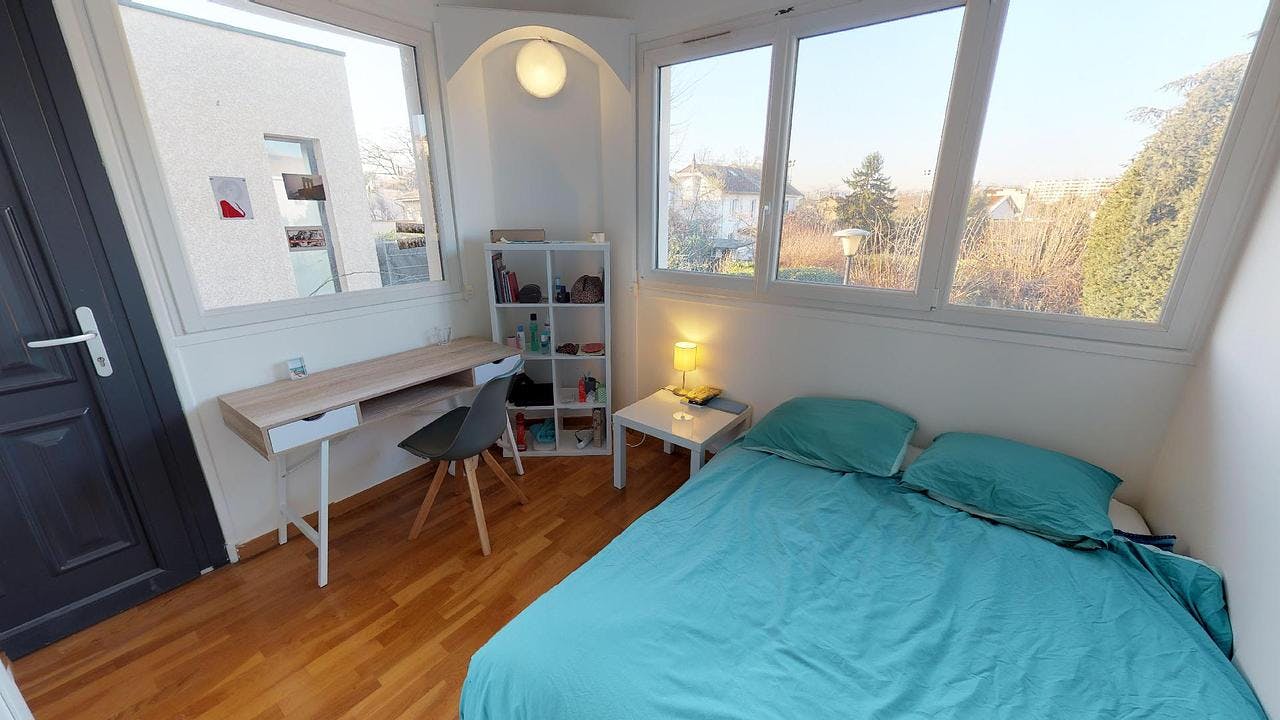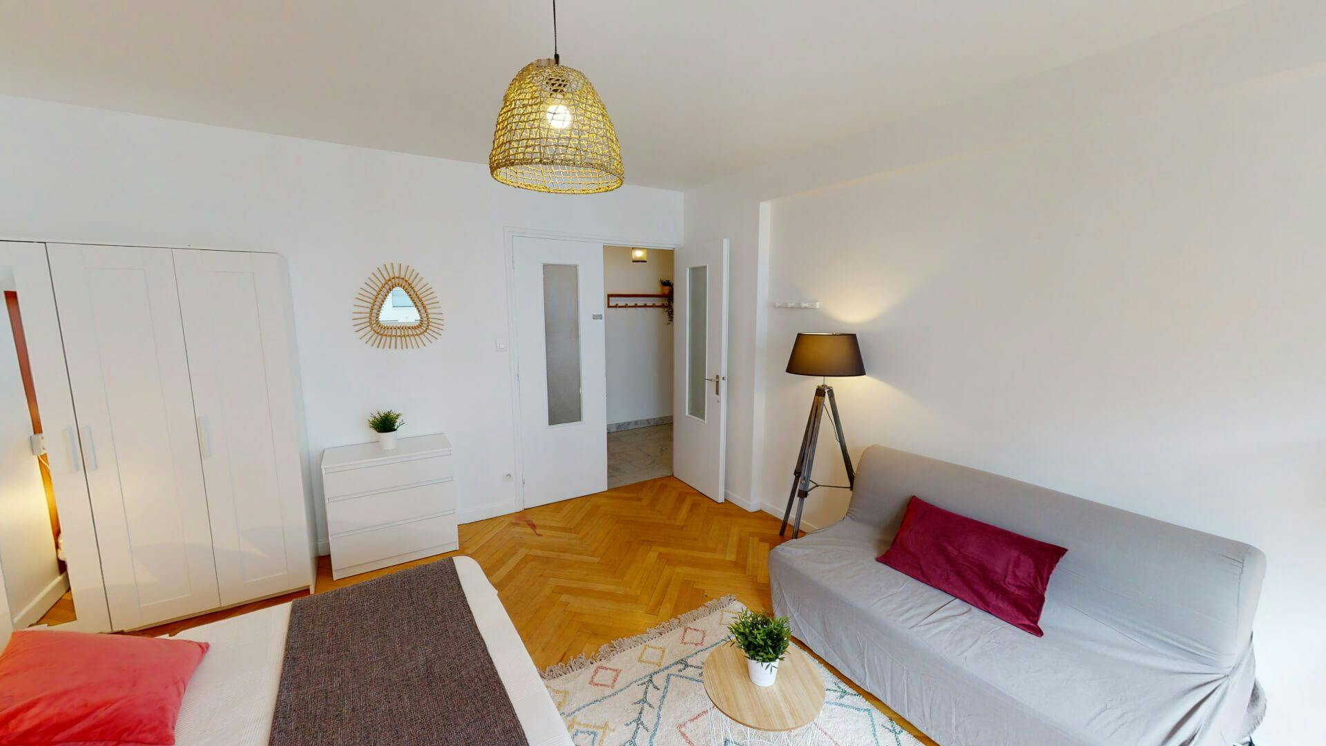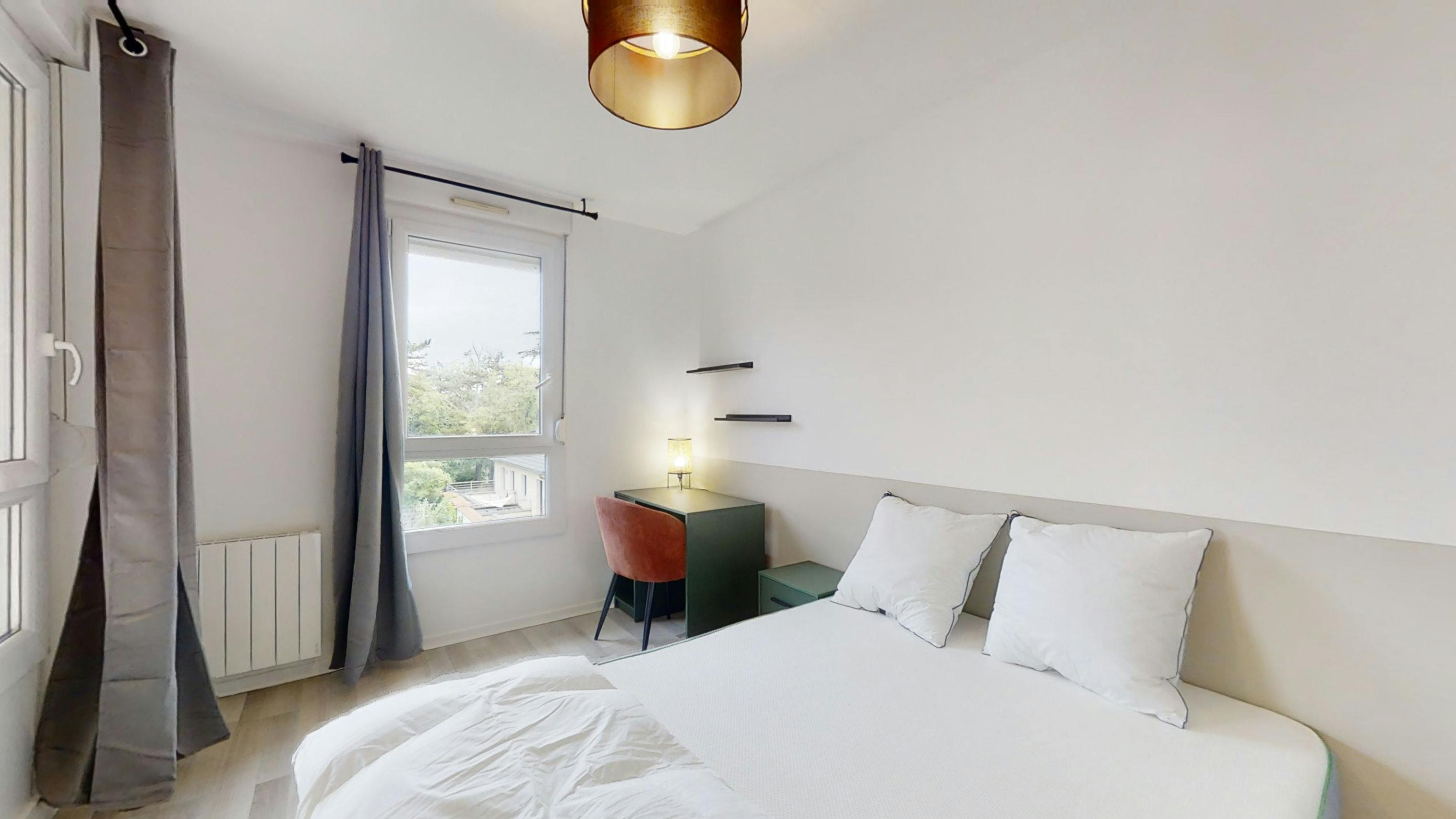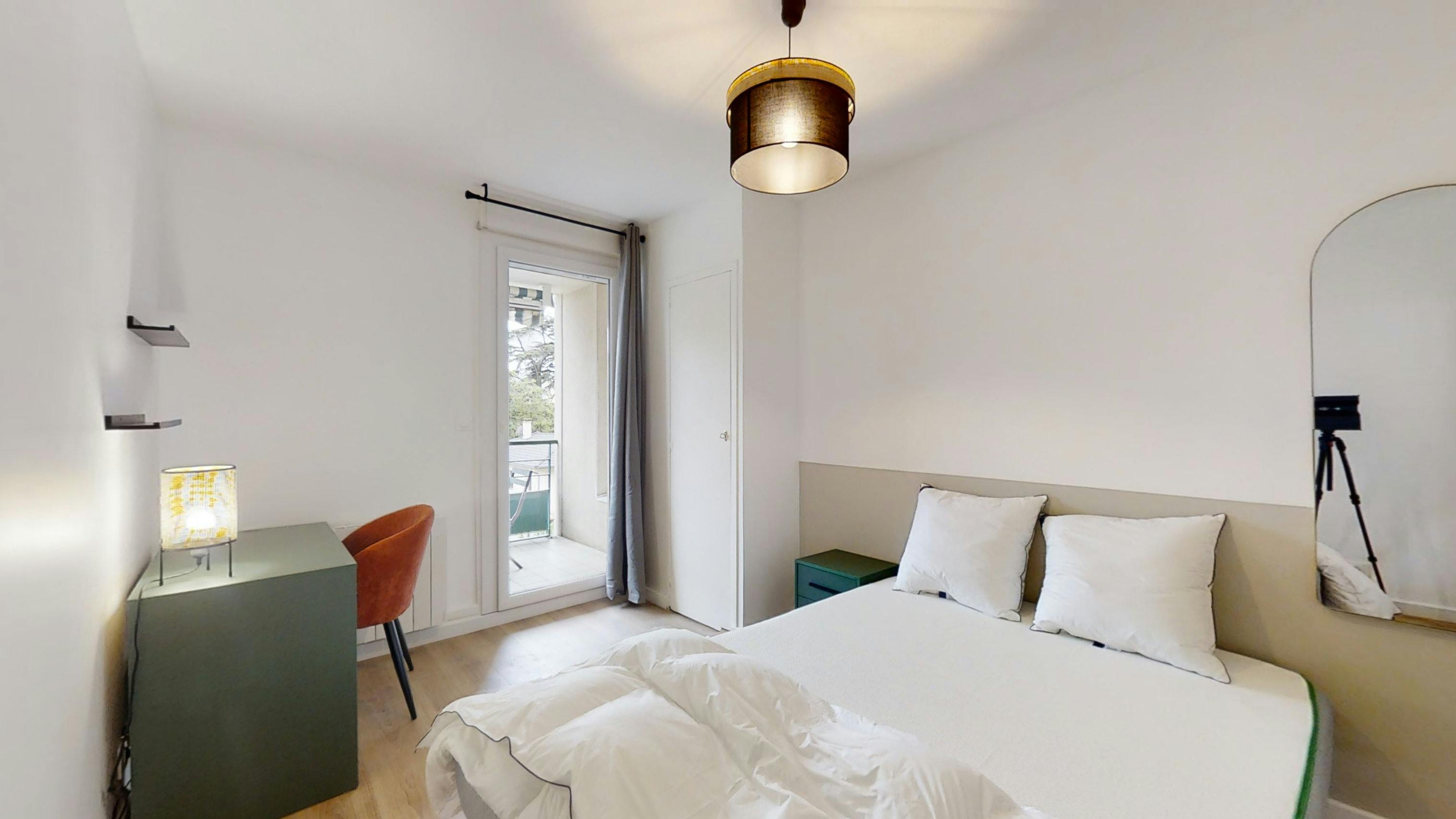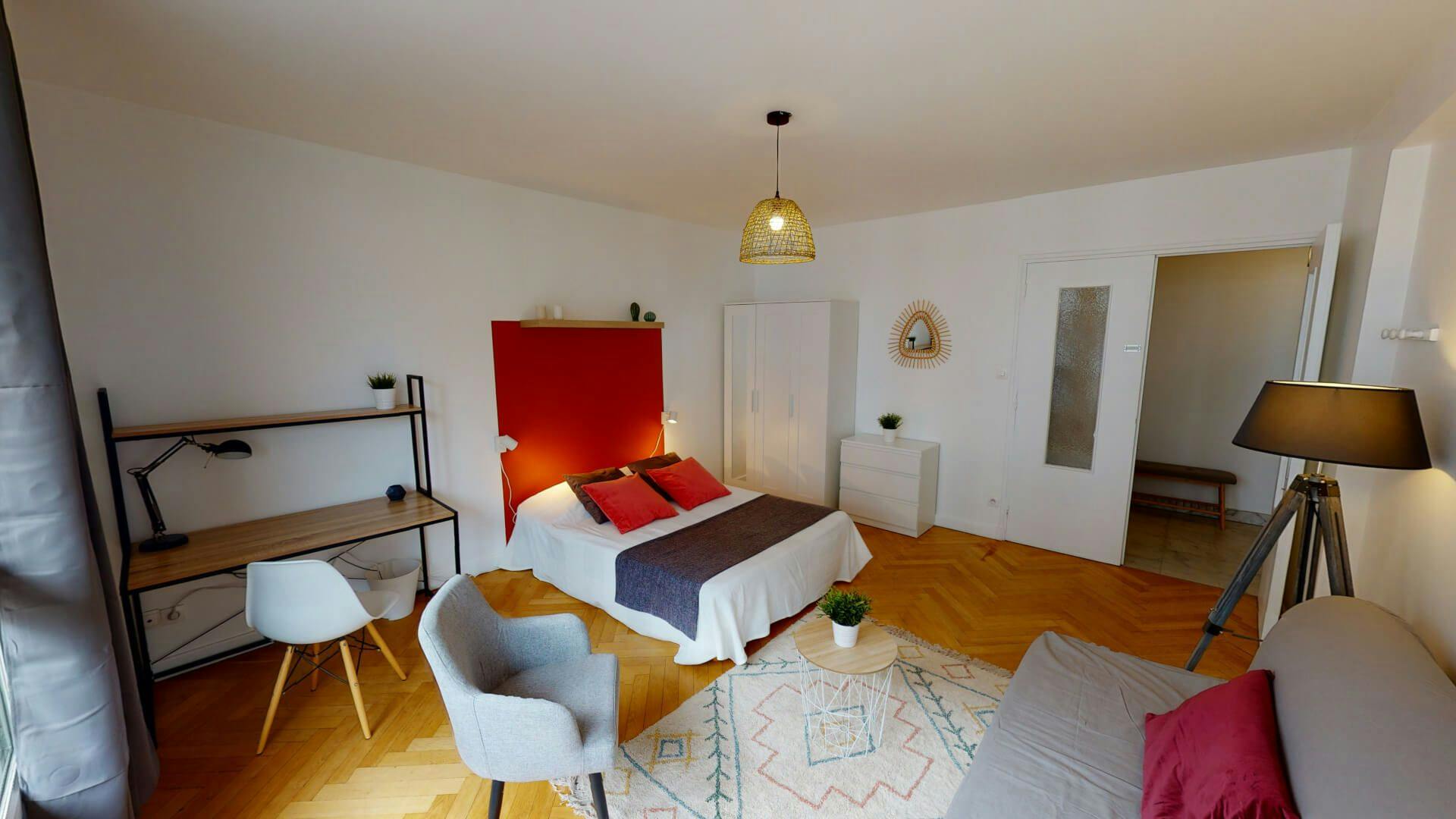 This lovely private bedroom in a fully equipped, furnished and all-inclusive flatshare in Lyon is a mix of comfort and design. It has got household furnishings, including a bed with pillows and duvet What is missing is your things to feel at home! The room can be locked if you need intimacy. The flatshare can be found in the Monchat neighborhood, in the heart of Lyon. Plenty of shops, public transports, restaurants are accessible close by. The apartment is on floor 0 without lift. It is entirely equipped and is composed of a large kitchen with refrigerator, microwave, pans, crockery, kitchen ustensils, kettle... The accommodation also contains an ironing board, a washing machine, a clothes rack, an iron. Additionally, you will find cleaning items in the accommodation: bagless hoover, dustpan and brush, broom, mop and bucket... Every Joivy furnished flatshare includes all expenses: housing insurance, water, electricity, unlimited wi-fi, condominium fees, household waste tax.