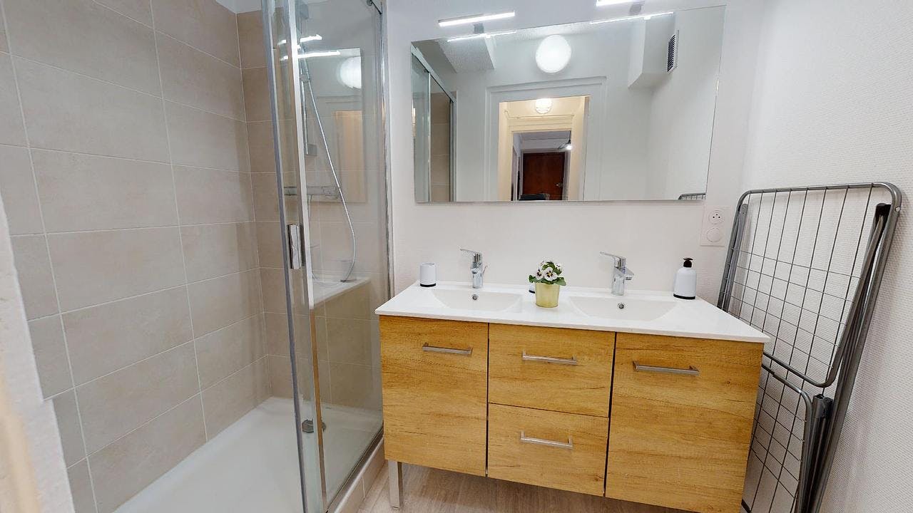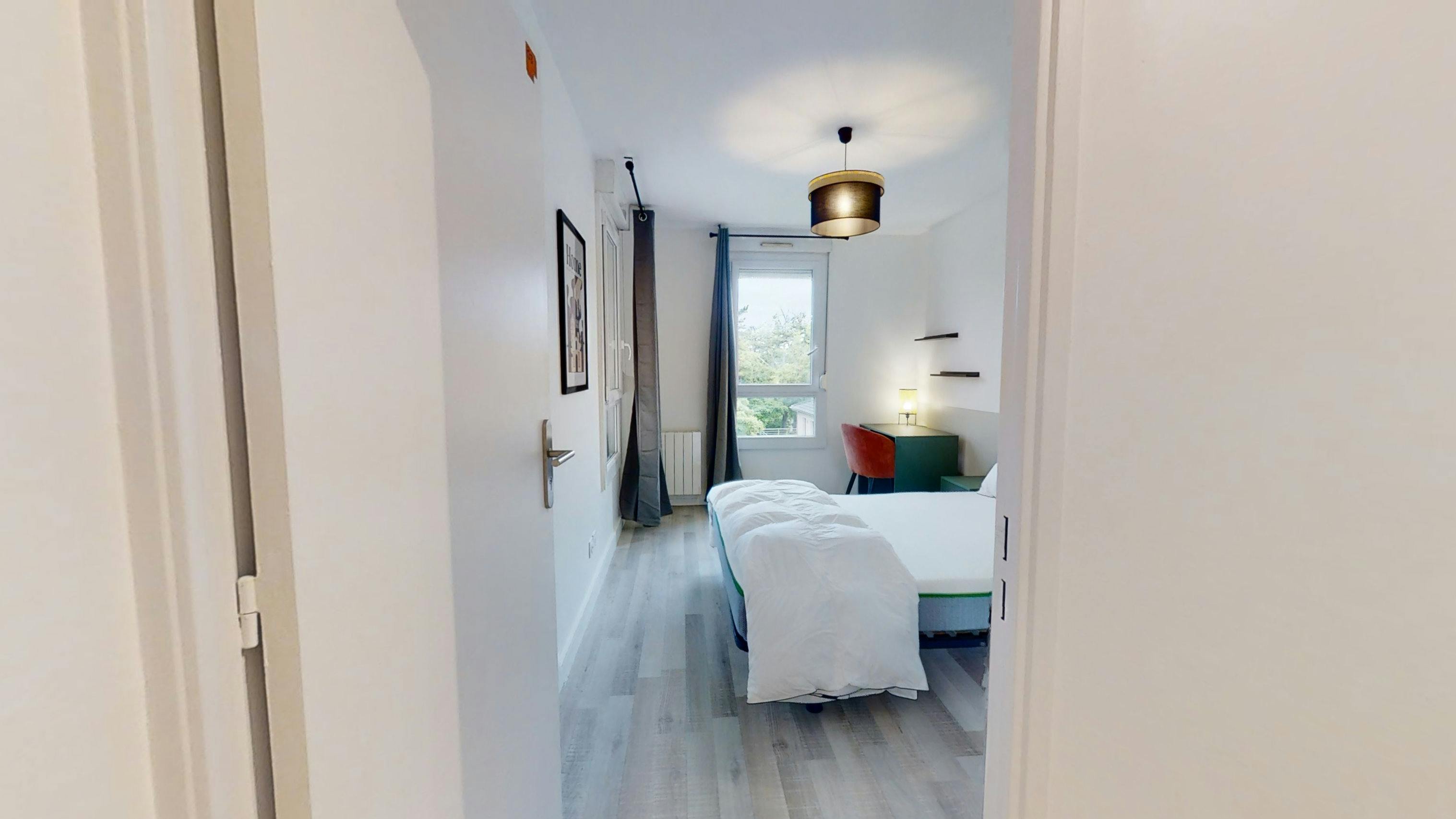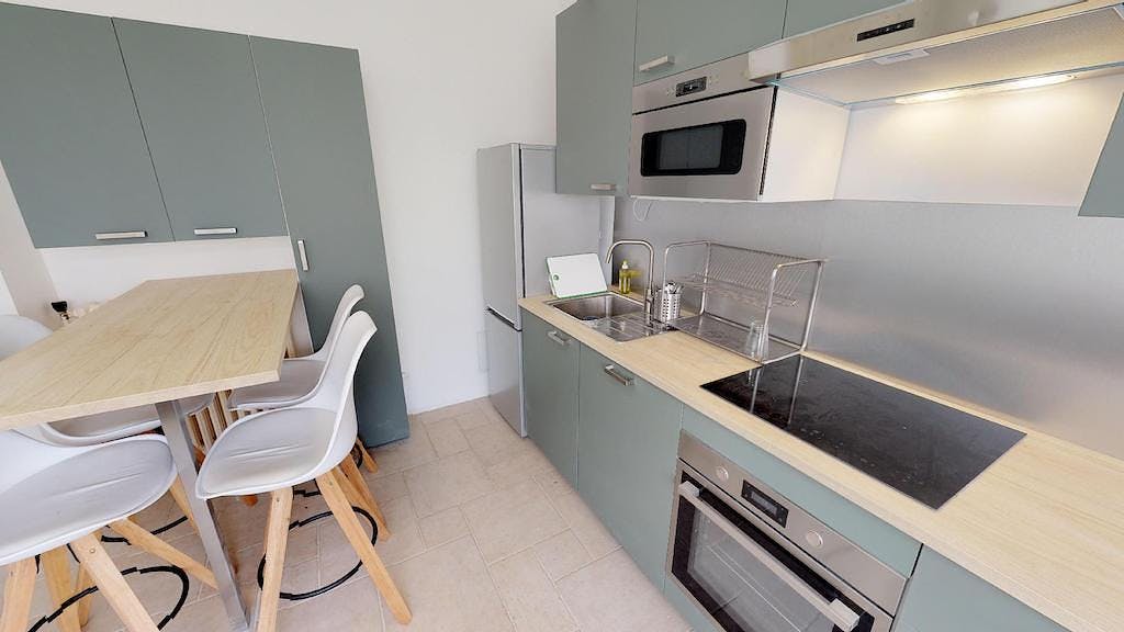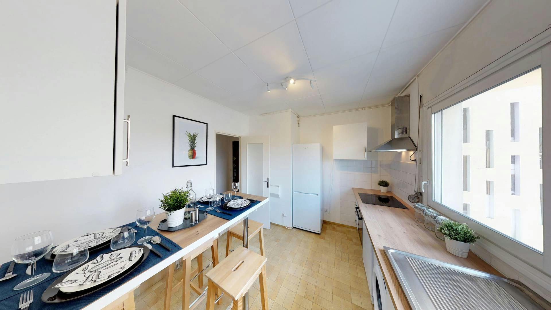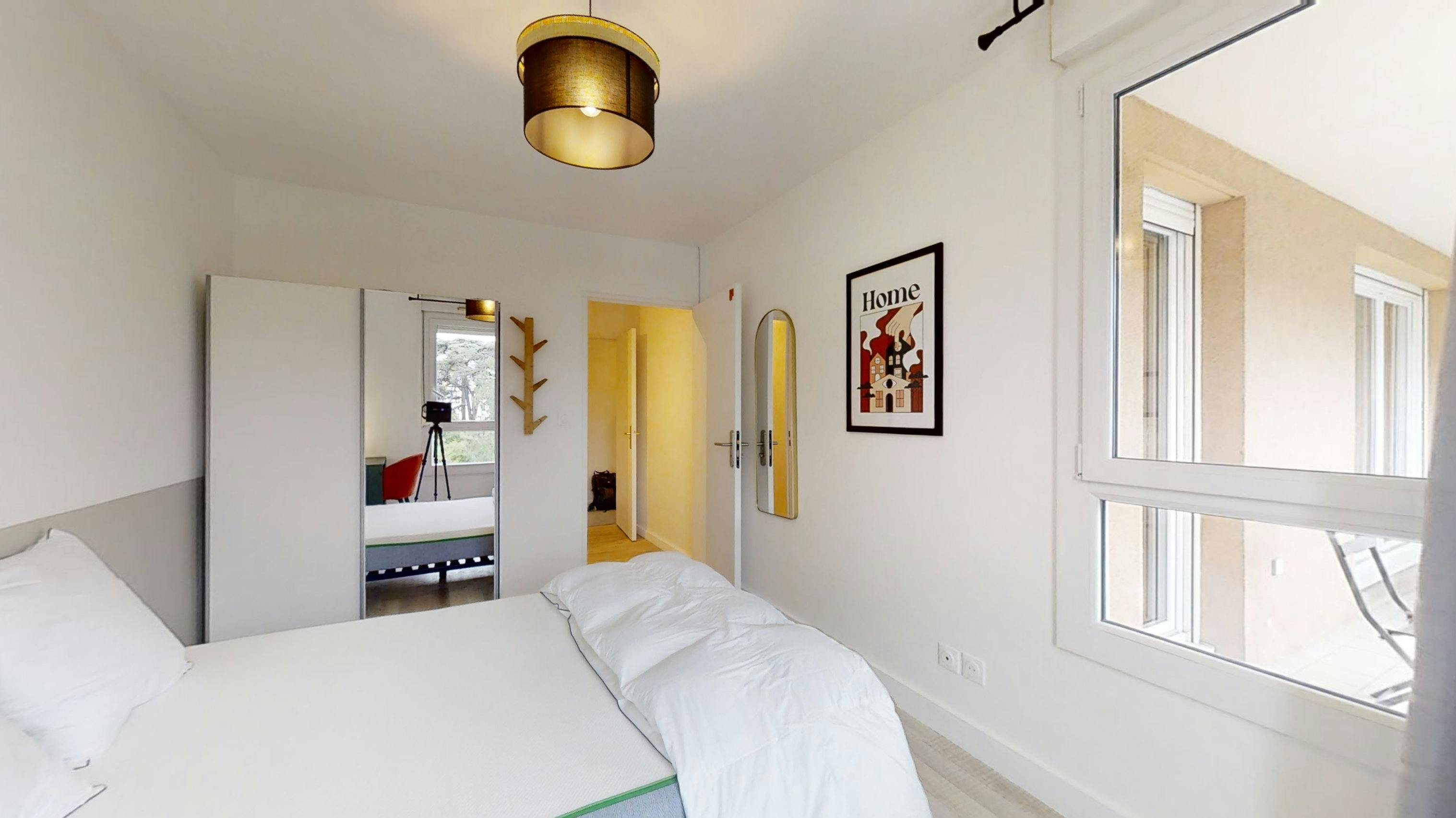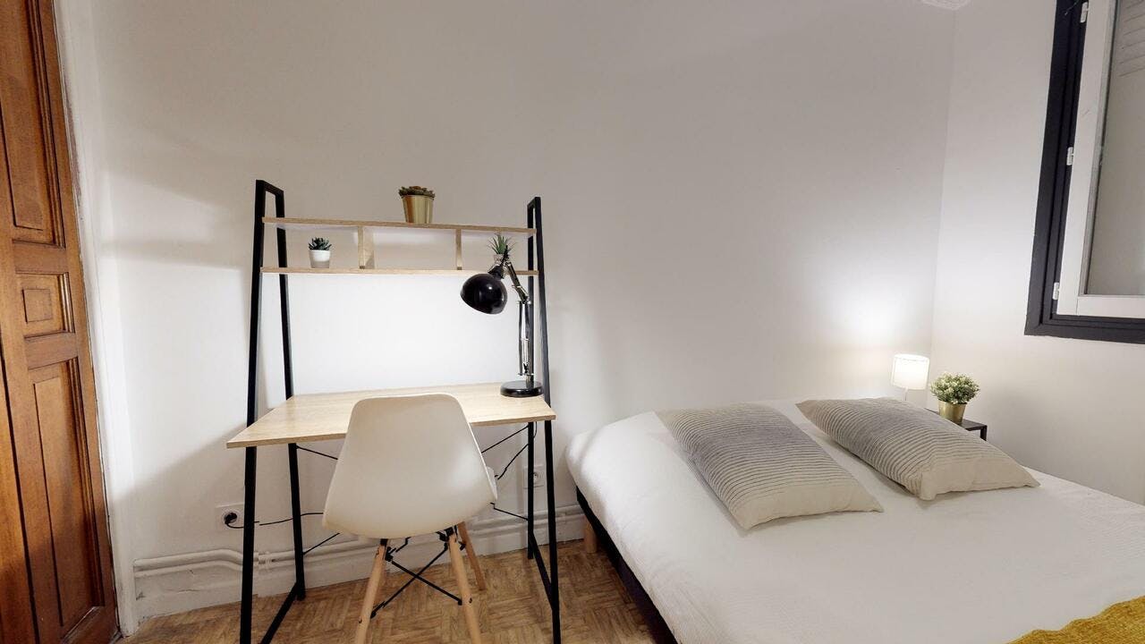 This lovely private bedroom in a fully equipped, furnished and all-inclusive flatshare in Lyon is a mix of comfort and design. It has got household furnishings, including a bed with pillows and duvet What is missing is your things to feel at home! The room can be locked if you need intimacy. The flatshare can be found in the Monchat neighborhood, in the heart of Lyon. Plenty of shops, public transports, restaurants are accessible close by. The apartment is on floor 0 without lift. It is entirely equipped and is composed of a large kitchen with refrigerator, microwave, pans, crockery, kitchen ustensils, kettle... The accommodation also contains an ironing board, a washing machine, a clothes rack, an iron. Additionally, you will find cleaning items in the accommodation: bagless hoover, dustpan and brush, broom, mop and bucket... Every Joivy furnished flatshare includes all expenses: housing insurance, water, electricity, unlimited wi-fi, condominium fees, household waste tax.