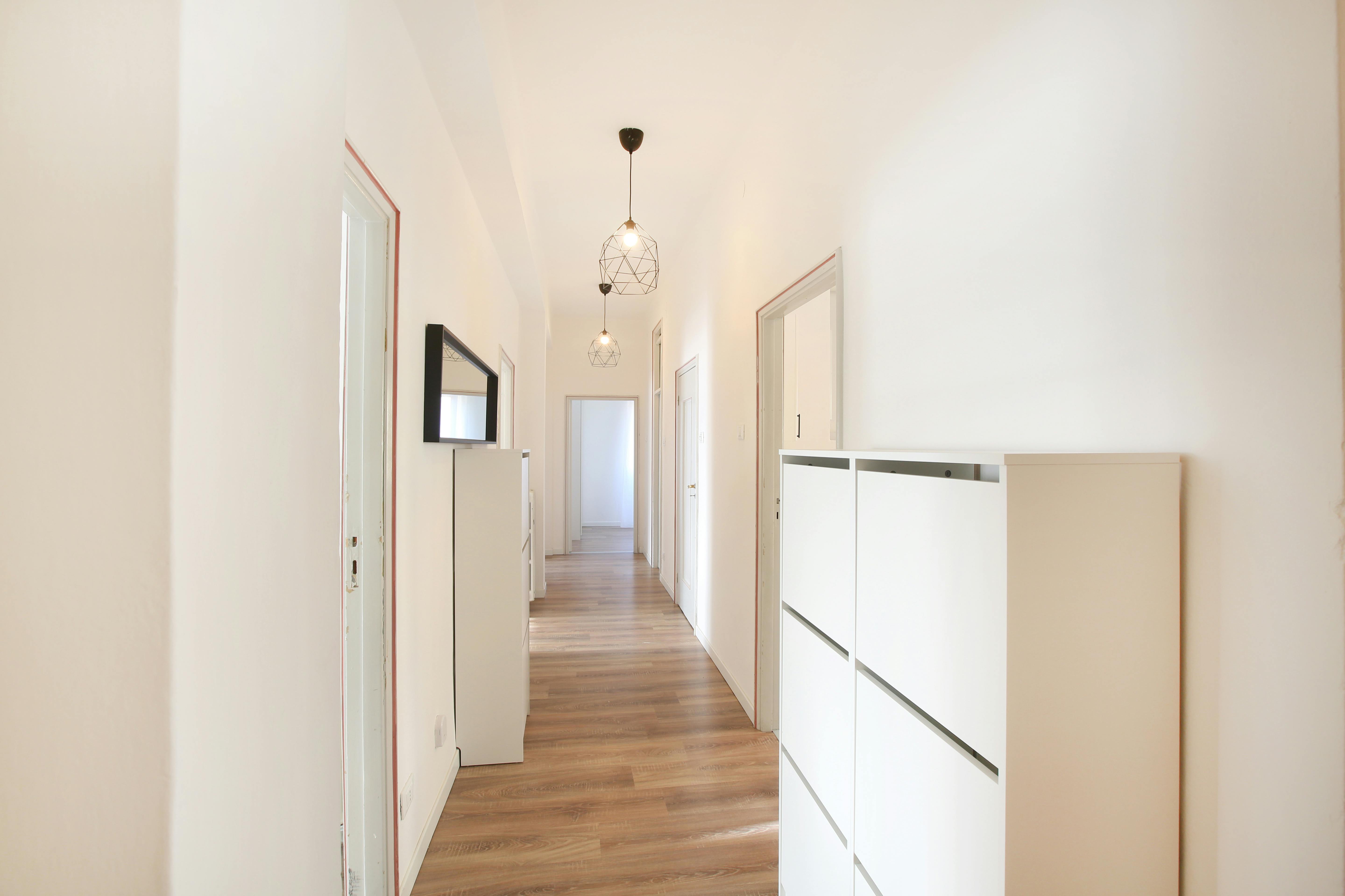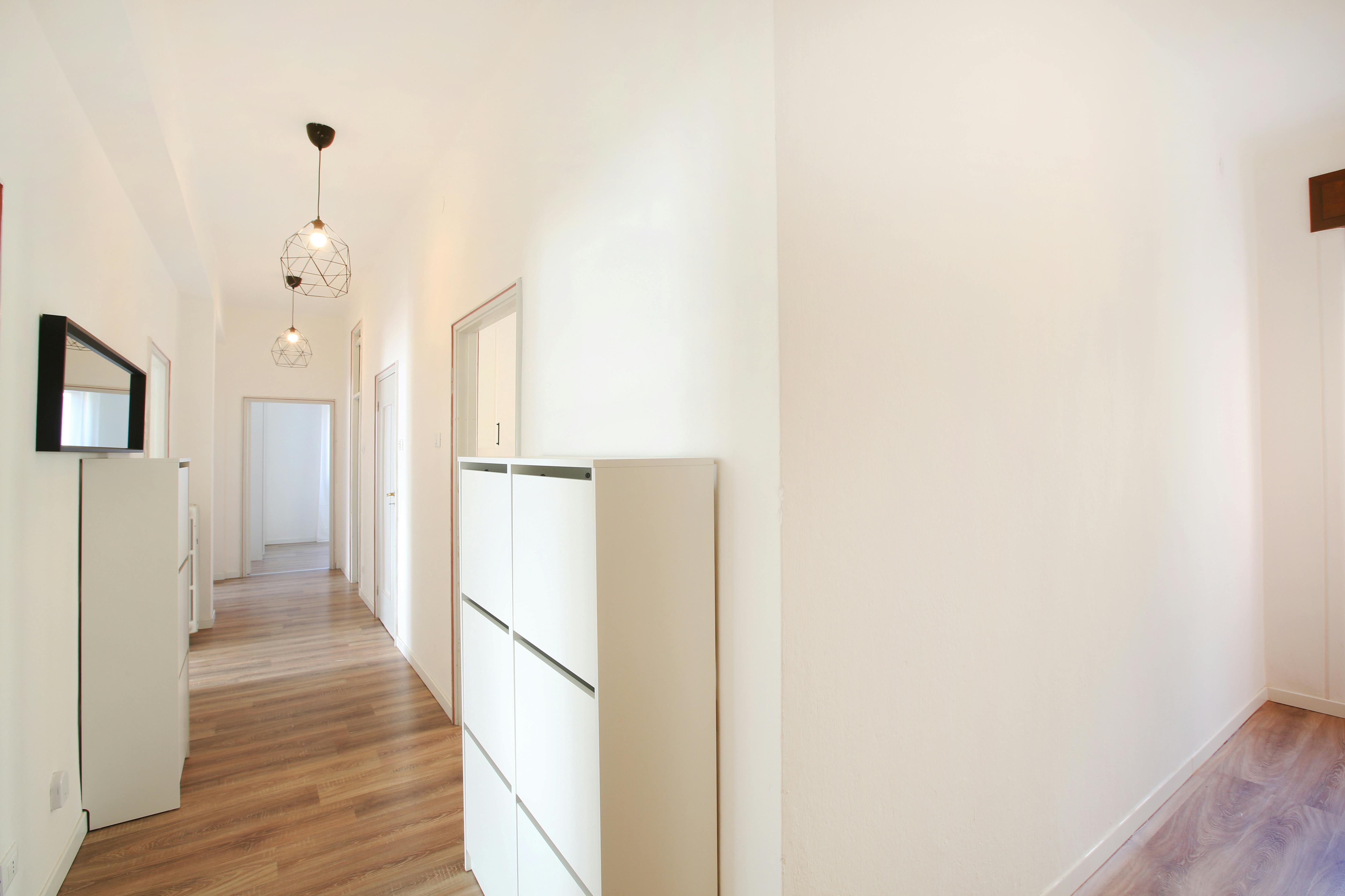 Located on the second floor, bright and very spacious. 90 m2 of surface. It consists of a kitchen, 2 bathrooms and 4 single rooms. The apartment is excellently renovated according to everything our students need. Equipped with WI-FI, washing machine, equipped kitchen.