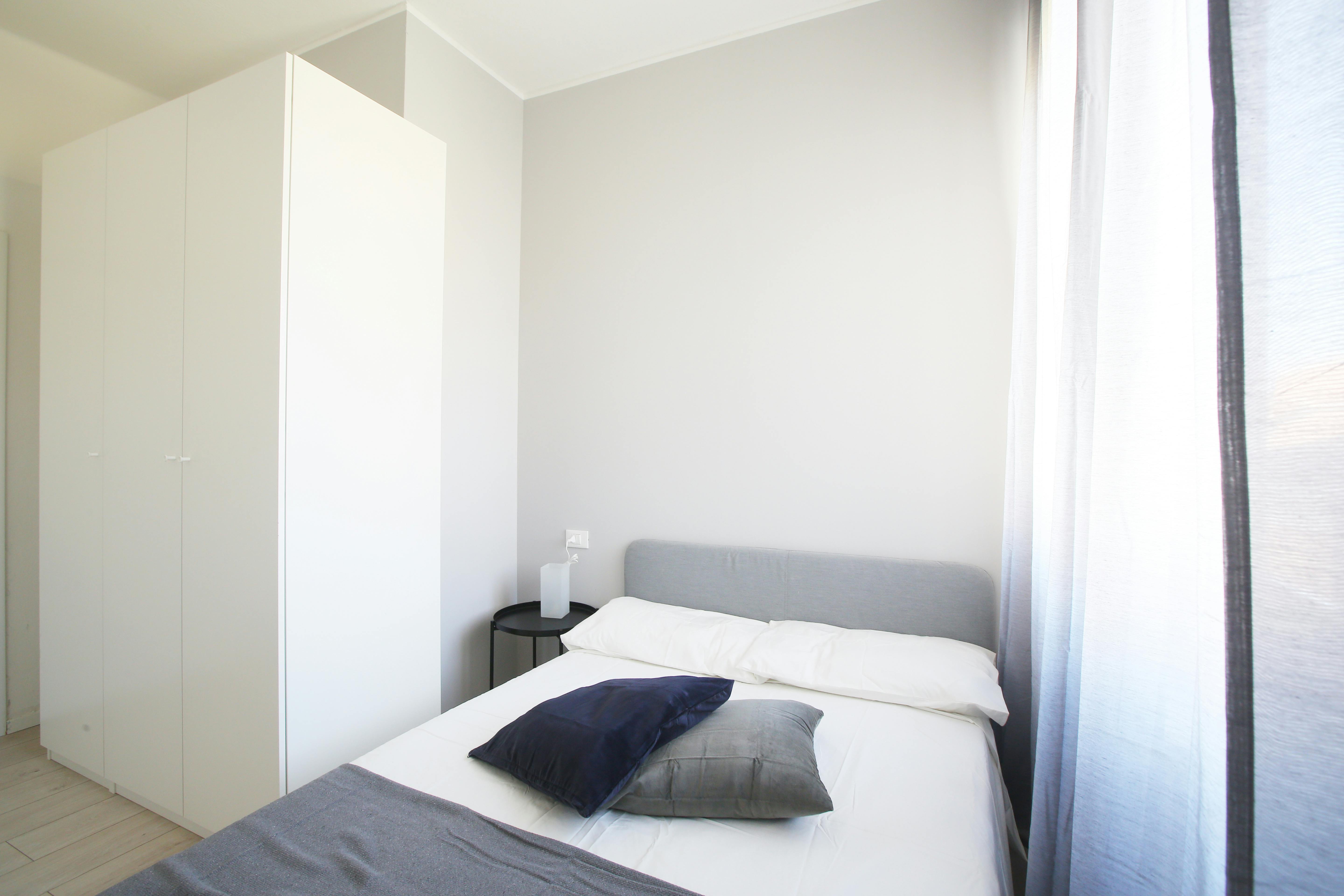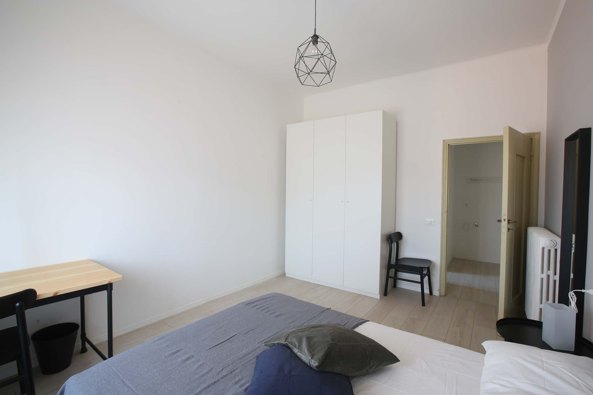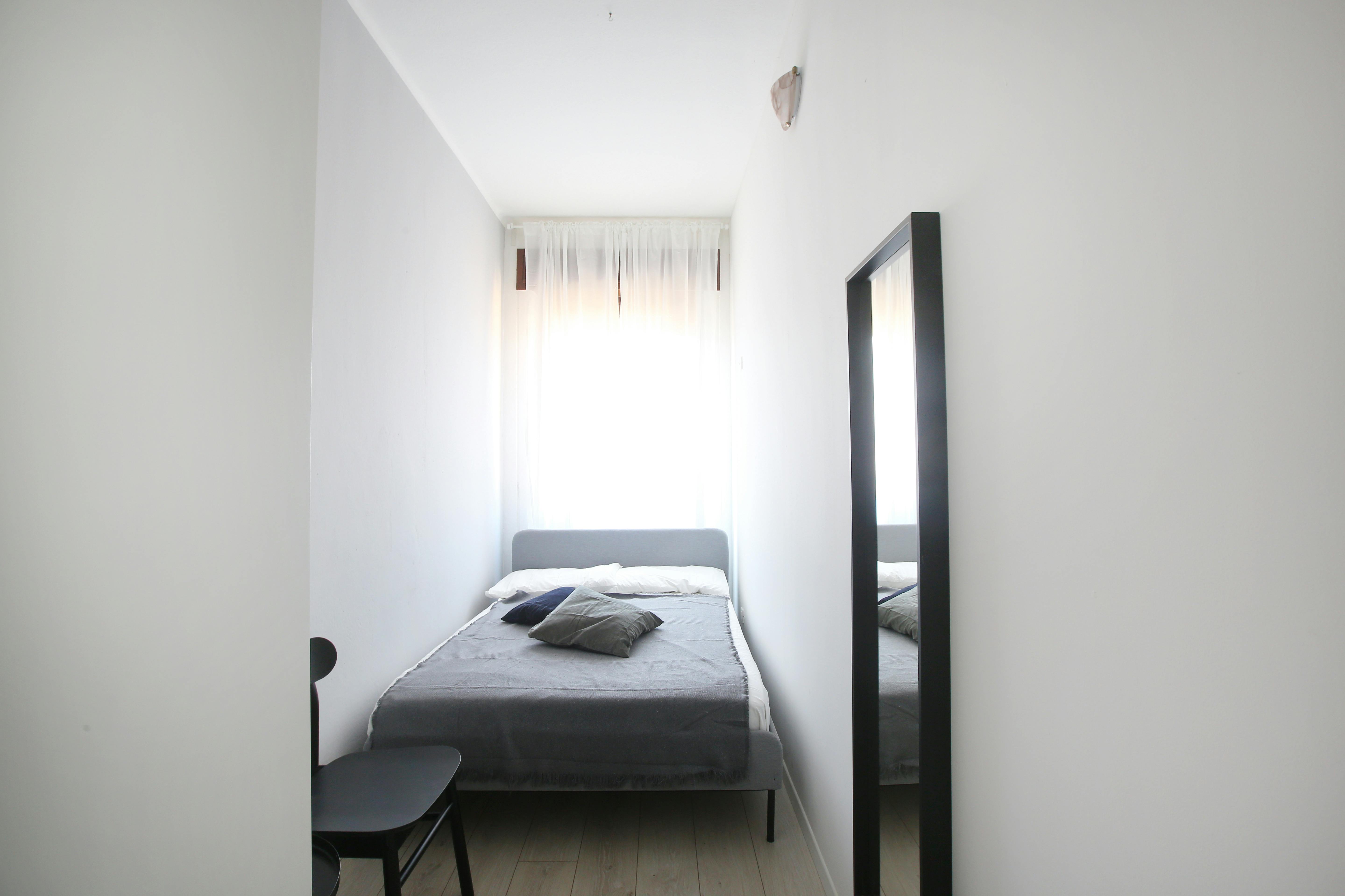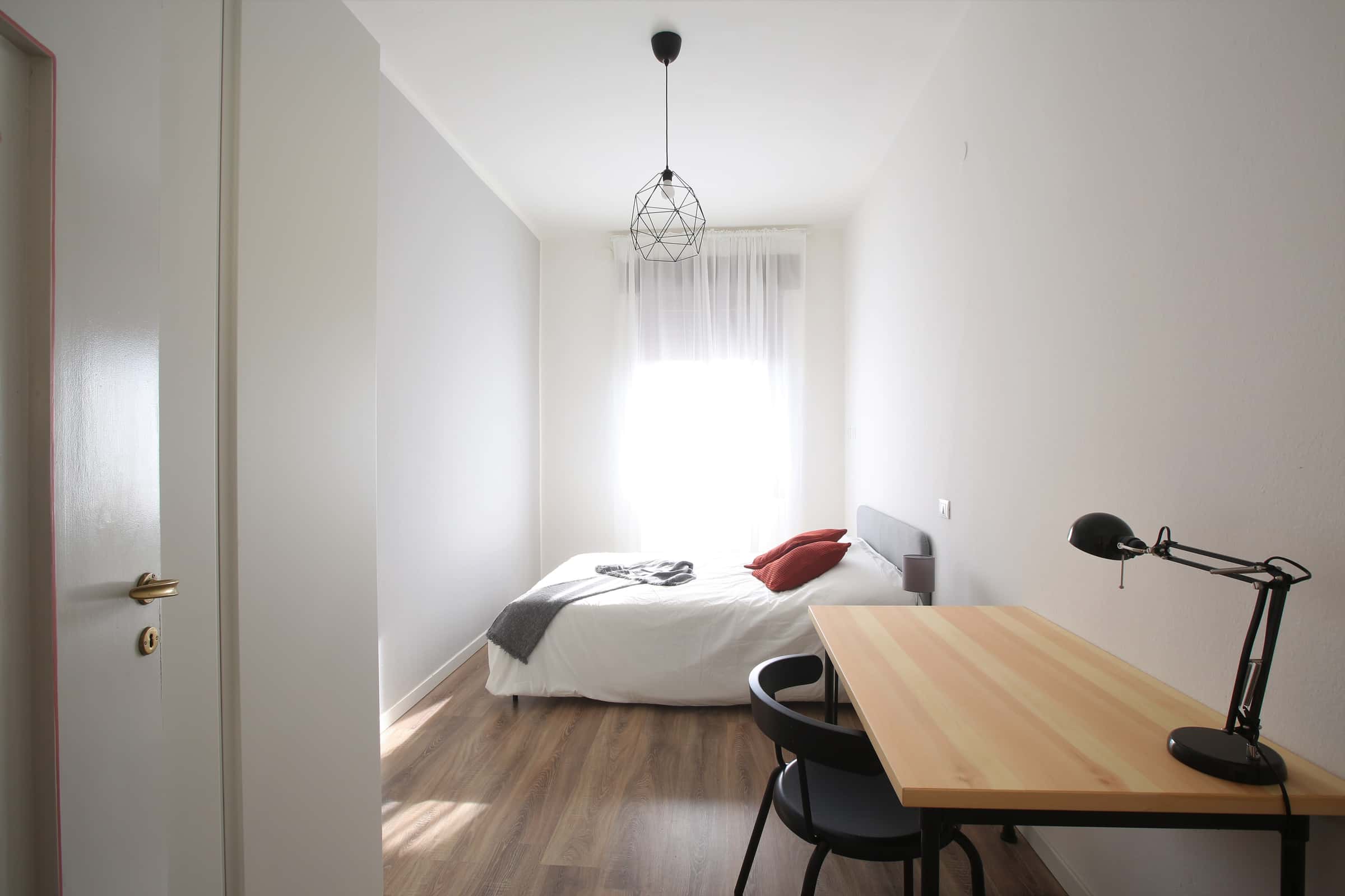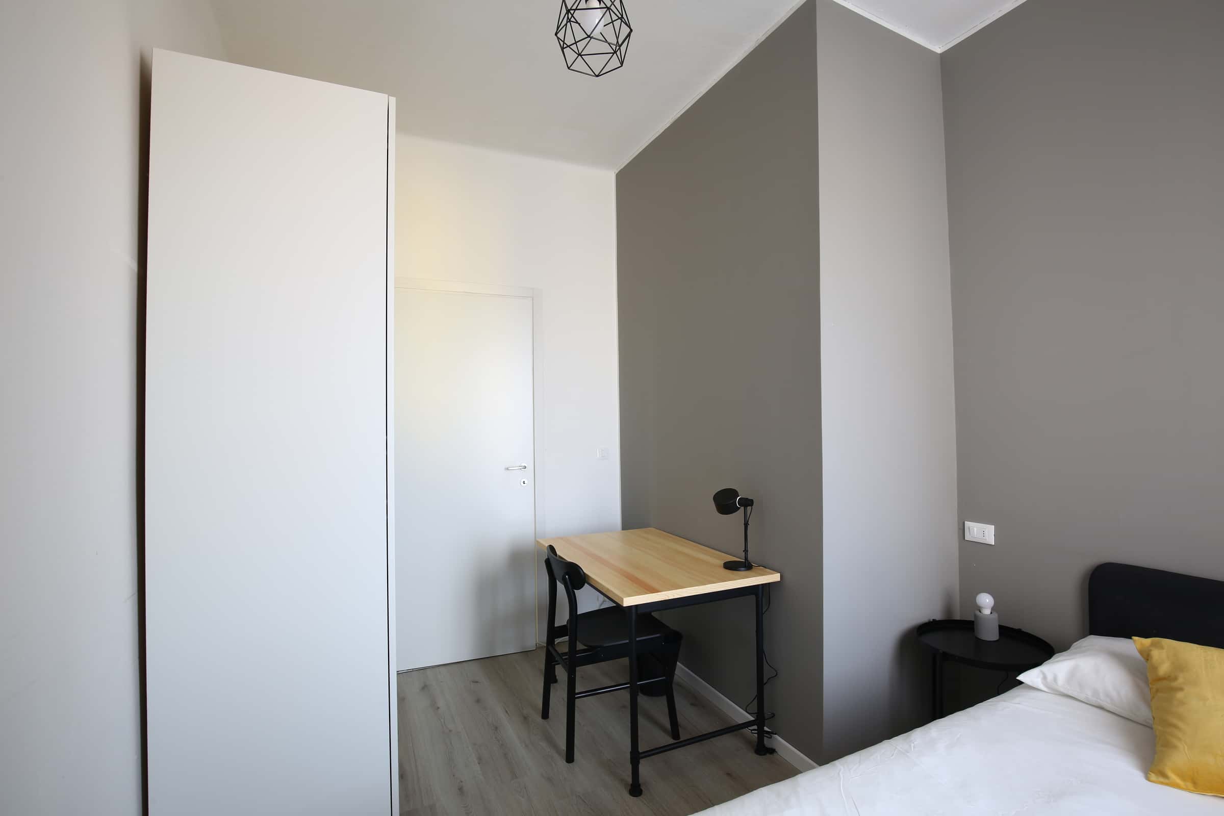 We rent a beautiful single room Stanza Semplice renovated specifically to offer comfort and convenience to our students, in a strategic and sought-after location. The room is equipped with a single bed, a 3-door wardrobe, a desk, a bedside table, curtains, a shoe rack and a bookcase.